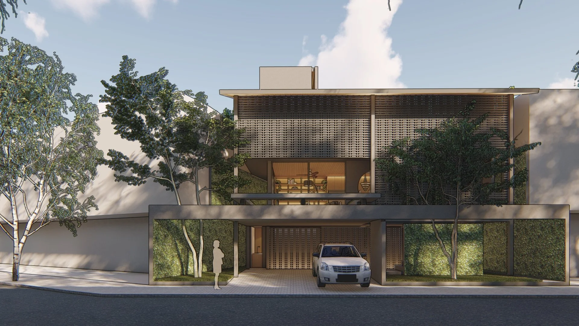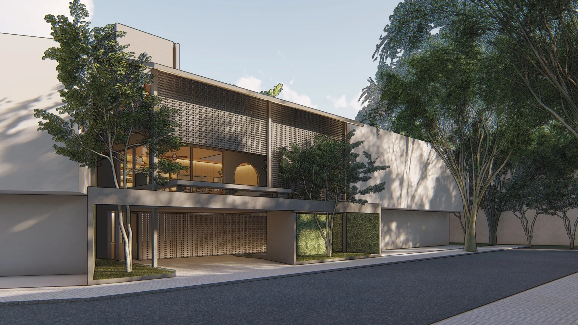 This three-storey residence is designed on an irregular plot, tapering toward the back. The façade is defined by a two-storey screen of breezeblocks, ensuring privacy while filtering light and air into the interior.